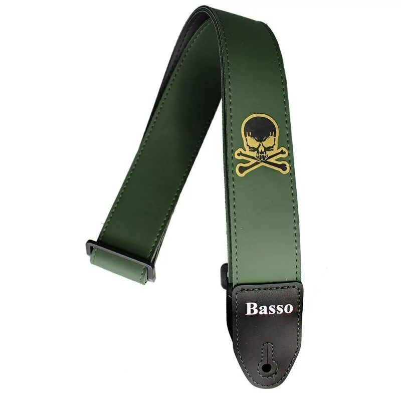 Correia em sintético VERDE MILITAR COM ESTAMPA DE CAVEIRA. Possui 5 cm de largura, forro em sintético para não absorver o suor e ponteiras em sintético duplo para maior durabilidade e segurança no instrumento. Comprimento regulável entre entre 0,85 E 1,50 METROS.